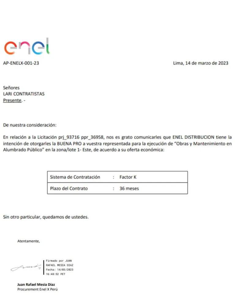 La empresa ENEL DISTRIBUCIÓN informa a LARI CONTRATISTAS que ha sido seleccionada para ejecutar obras y mantenimiento en alumbrado público en la zona/lote 1 Este.