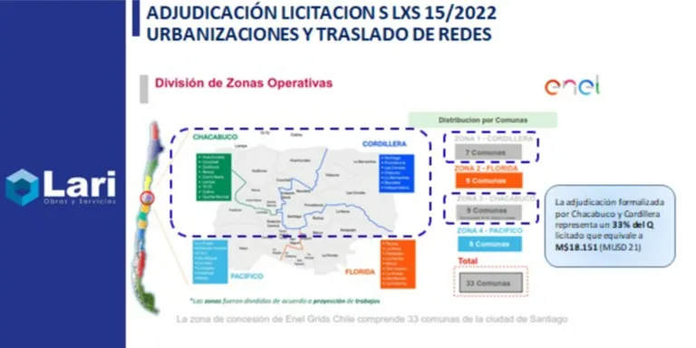 Enel Chile S.A. ha otorgado a la empresa LARI SPA el contrato para llevar a cabo las obras de urbanización y traslado de redes para Enel Dx en las zonas 1 y 3 de Chile. El contrato comenzará el 7 de febrero de 2023 y se espera que LARI SPA cumpla con los términos y condiciones establecidos en las bases de licitación y especificaciones técnicas.